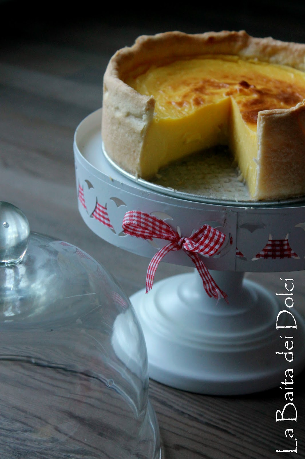 A parte unire i tuorli, lo zucchero e la maizena, mescolando energicamente con una frusta fino ad ottenere un composto spumoso. Rimuovere il baccello di vaniglia dal composto di latte e panna e riportarlo a sobbollore. Versarlo gradualmente sui tuorli continuando a mescolare. Trasferire il tutto in un pentolino e rimettere sul fuoco a fiamma bassa portando lentamente ad ebollizione. Mescolare costantemente finché il composto non si addensi. Lasciar raffreddare il composto prima di versarlo sulla pasta brisée. Infornare in forno preriscaldato a 180 gradi per 40 minuti. Sfornare, lasciar raffreddare e riporre in frigo per almeno 2 ore prima di servire.